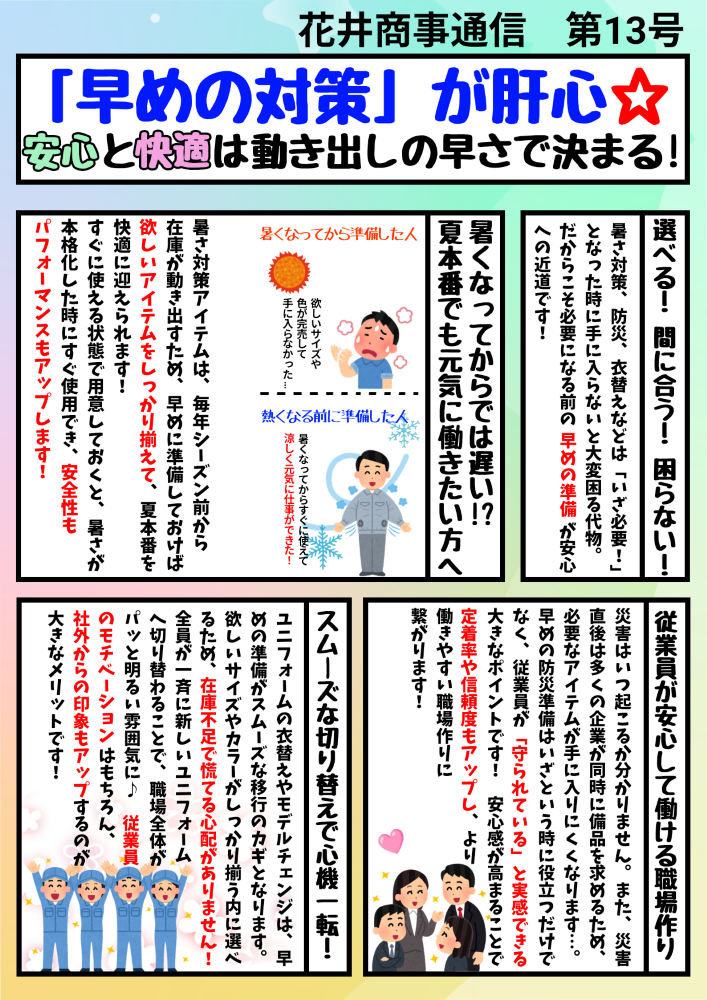 今回の『花井商事通信 第13号』では、暑さ対策や防災対策、ユニフォームの早期準備の重要性についてお伝えしています。 早めの対策が従業員の働きやすさや会社の活気を向上させるポイントになります!当社の取り組みとして導入事例もご紹介させていただきました。